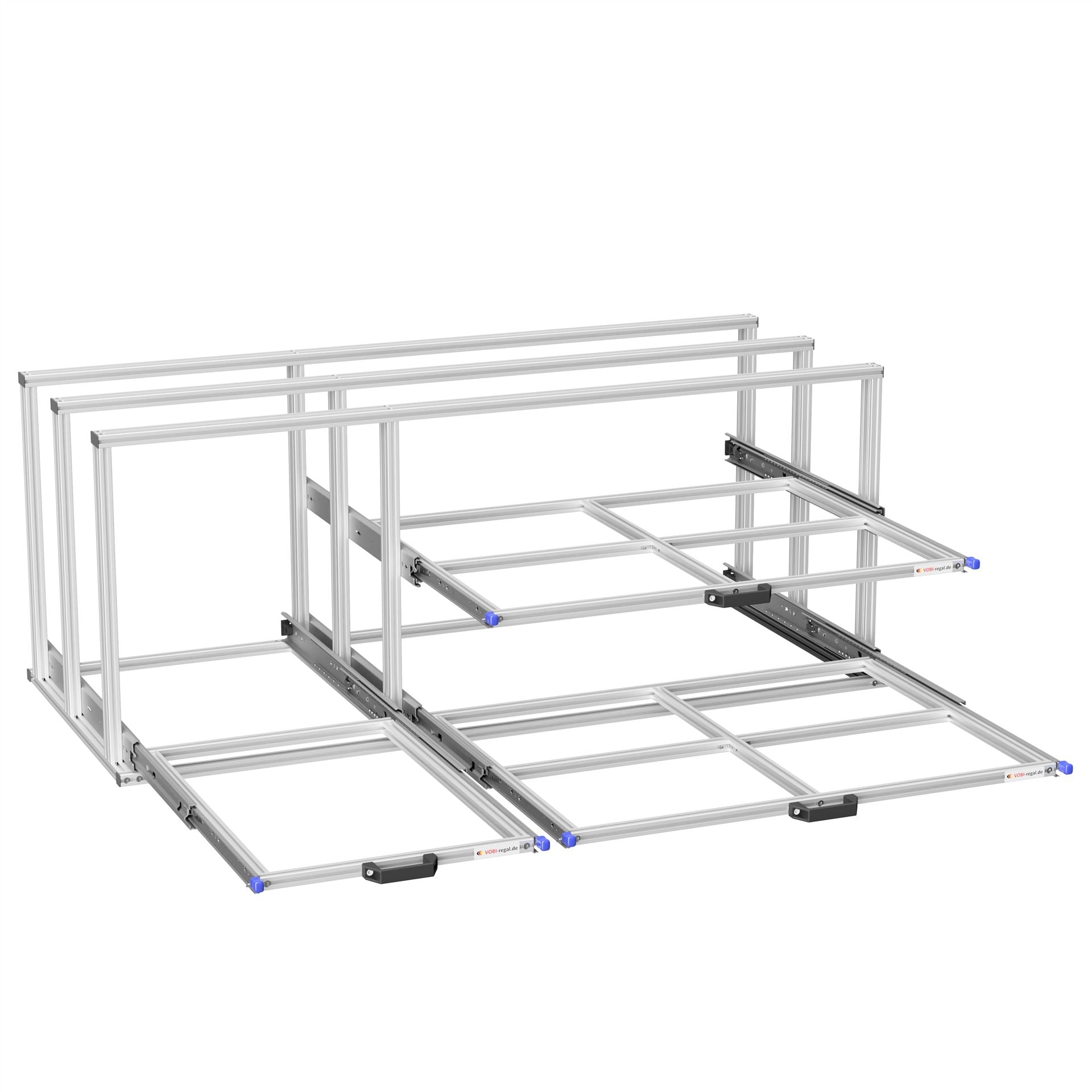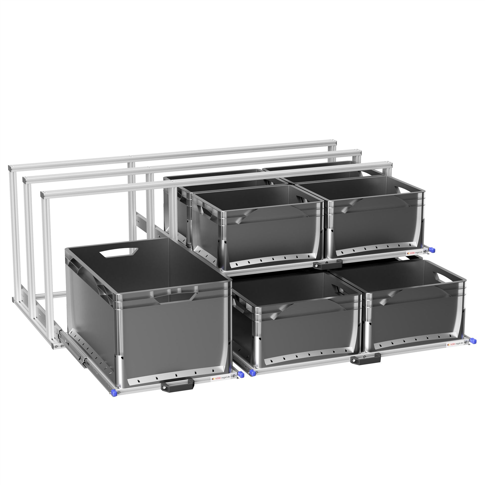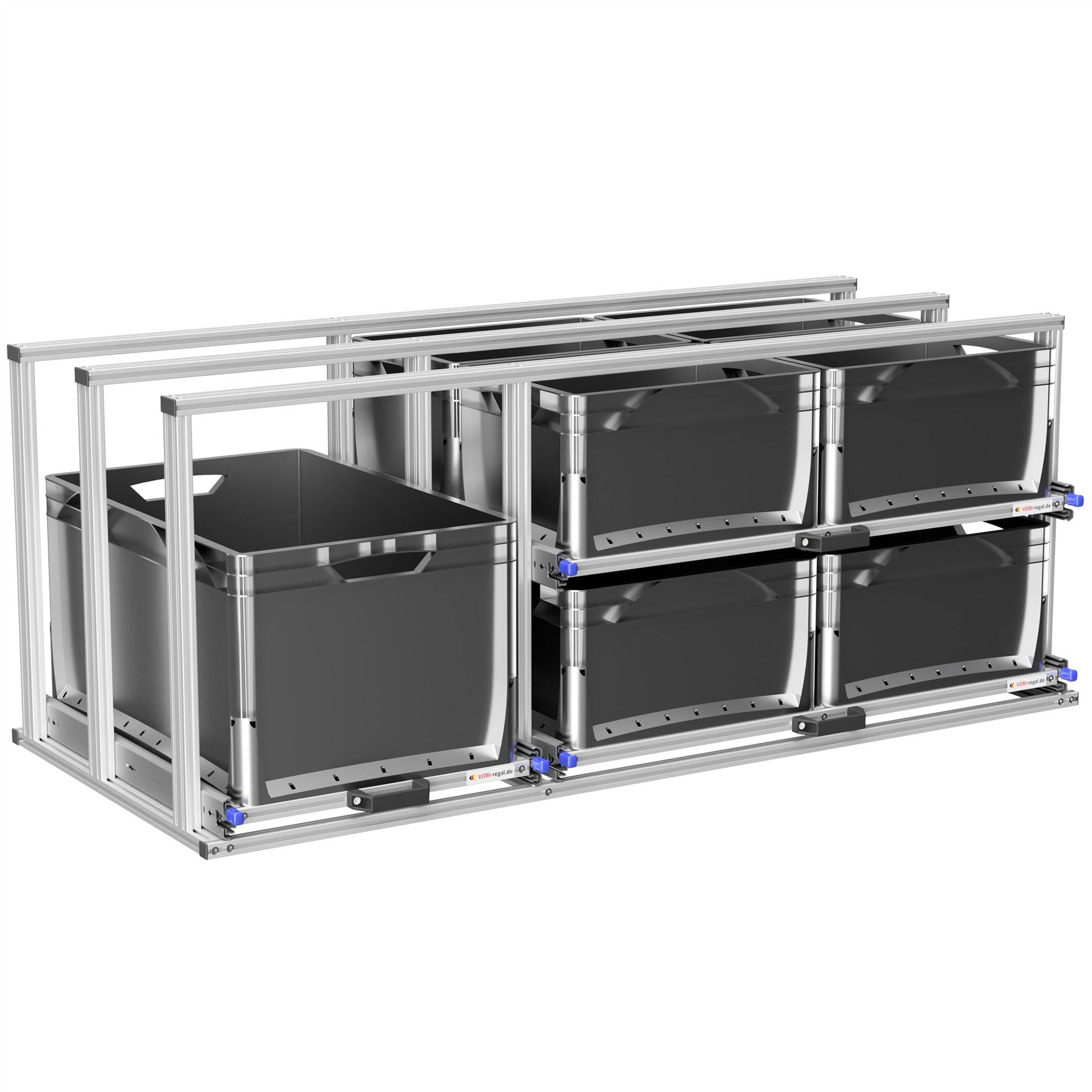Der Auszug wurde so konstruiert, dass er acht Euroboxen à 400×300 mm und eine Euroboxen à 600×400 mm aufnehmen kann.