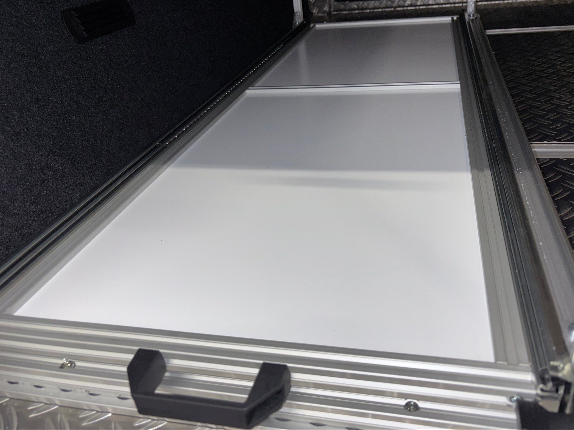 Statt der Regalbox können Sie auch eine Einlegeboden-Sandwichplatte aus Aluminium in den Auszug bzw. Regalboden integrieren. In diesem Fall wird keine Regalbox mehr benötigt, und Sie können beispielsweise einen Kocher direkt auf dem Auszug bzw. Regalboden platzieren.