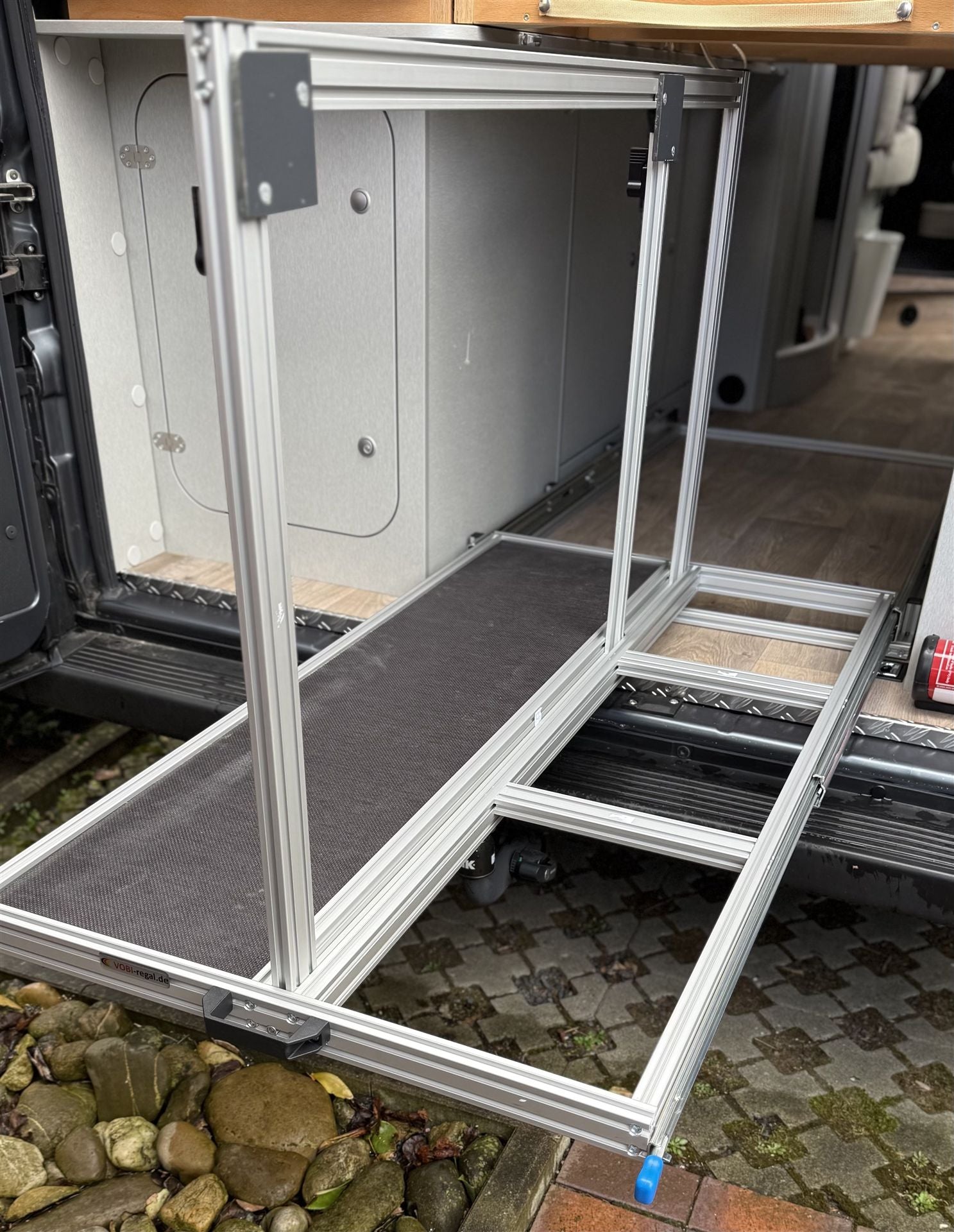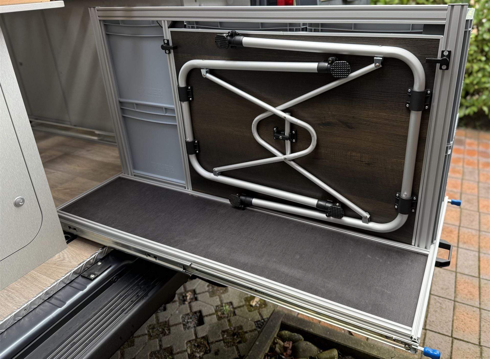 Der VOBI Kastenwagen Plattformauszug wurde speziell für Kastenwagen konzipiert und kombiniert höchste Funktionalität mit minimalem Platzbedarf. Das innovative System ermöglicht einen vollausziehbaren Stauraum auf engstem Raum und integriert dabei ein praktisches Tischhaltesystem. So lässt sich der Tisch sicher und griffbereit verstauen, ohne zusätzlichen Platz zu beanspruchen. Ideal für Camper, die Wert auf Ordnung, Effizienz und flexible Nutzung legen.