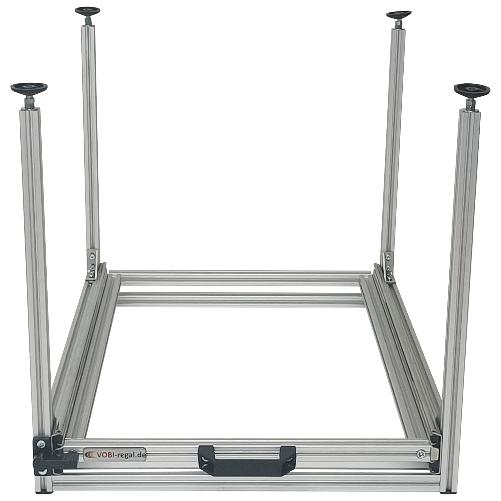 Die Höhe des Regals wird individuell nach Ihren Angaben – z. B. entsprechend der Höhe Ihrer Garage – gefertigt. Sie können dabei auch unterschiedliche Längen für die Standbeine angeben, um Höhenunterschiede, etwa durch einen Absatz, auszugleichen.